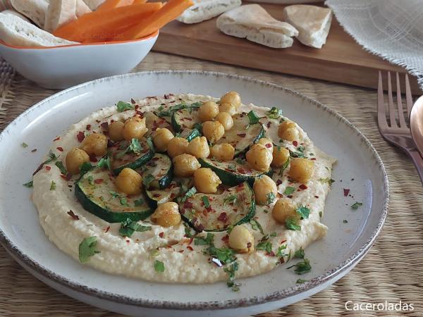 Hummus con calabacín plancha y garbanzos fritos especiados