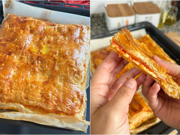 Empanada de hojaldre rellena de chorizo y queso